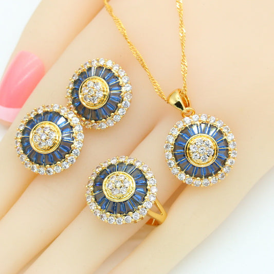 New Design Gold Jewellery Set Sets For Women Blue Crystal Stud Earrings Necklace Pendant Ring Bracelet Gift Box