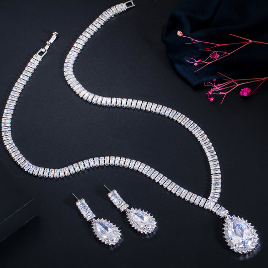 Water Drop Cubic Zirconia CZ Crystal White Gold Color Bride Wedding Necklace Earring Jewelry Set for Women Costume Accessories